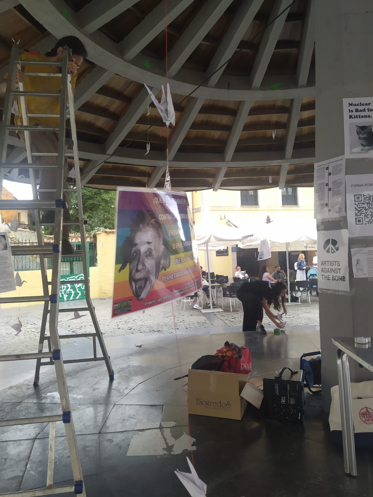 Instalación artística con sonido, movimiento e infografías interviniendo en la Plaza del Paraguas, como parte del Worldwide Peace Wave 2023 organizado por el International Peace Bureau.